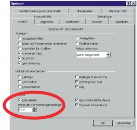 You can see the left row within the word window. This is the so-called structured view, which you can get by choosing the Normal option under View. The names of the paragraph structures are displayed if you choose the point Options under Extras. Within the popup menu there is a possibility to set the width of the style sheet view. (see below). This is how it is displayed in German Word97, but is similar in other language word systems.
