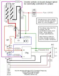 Lightweight chargers for charging battery banks below the line voltage are not isolated from the AC source since they have no transformers - they apply AC neutral to one side of the pack through a bridge rectifier and AC ground to the chassis. Any conduction between the pack and the chassis will create a potential shock hazard that is detected by the ground fault detector on the AC side of the charger, which then triggers and stops the charge. It is not possible to properly use such a charger unless the pack is properly isolated. Since an aging DC motor can have small current leakage due to the accumulation of conductive dust from brush wear it is best if the pack is isolated from the controller and motor during charging - this is one of the reasons for using both dual contactors and switchable pre-charge resistors as shown in the diagram at left. If such a well isolated pack causes a ground fault when a charge is attempted the likely cause is some battery leakage or spilling of electrolyte causing a conductive path to the chassies, which (if the case is not perforated) may be corrected by cleaning the battery with a solution of sodium bicarbonate (for acid type batteries), or weak acetic acid (for base type batteries), followed by a water rinse and drying.