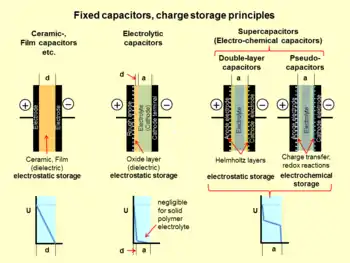 Besides the conventional static storage of electric energy in an electric field, two other storage principles to store electric energy in a capacitor exist. They are so-called electrochemical capacitors. In contrast to ceramic, film and electrolytic capacitors, supercapacitors, also known as electrical double-layer capacitors (EDLC) or ultracapacitors do not have a conventional dielectric. The capacitance value of an electrochemical capacitor is determined by two high-capacity storage principles. These principles are: