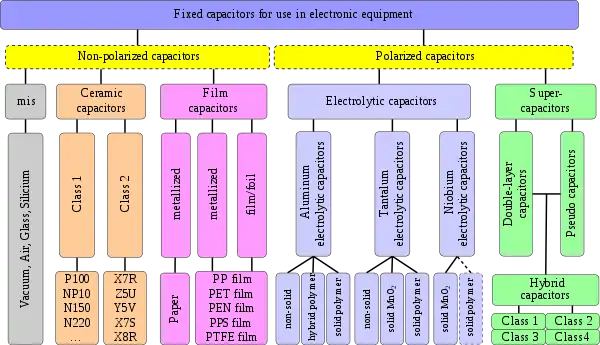 The most important group is the fixed capacitors. Many got their names from the dielectric. For a systematic classification these characteristics can't be used, because one of the oldest, the electrolytic capacitor, is named instead by its cathode construction. So the most-used names are simply historical.