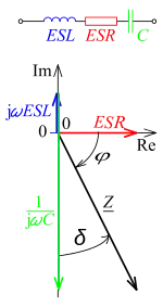- ↑ Murata: Basics of capacitors, lesson 2 Includes graph showing impedance as a function of frequency for different capacitor types; electrolytics are the only ones with a large component due to ESR