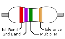 Axial resistors are also called "thru-hole" resistors because they cross the plate to which they are welded. Four band identification is the most commonly used color coding scheme on all resistors. It consists of four colored bands that are painted around the body of the resistor. The values of the resistors belong to series. The best-known series with 4 rings is called the E12 serie because this series contains 12 values. The values are part of the preferred numbers. The scheme is simple: The first two numbers are the first two significant digits of the resistance value, the third is a multiplier, and the fourth is the tolerance of the value. Each color corresponds to a certain number, shown in the chart below. The tolerance for a 4-band resistor will be 2%, 5%, or 10%