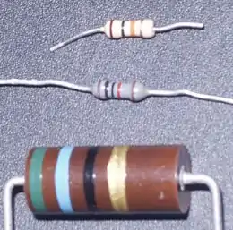 The third example is a larger power resistor, and is labeled green (5) - blue (6) - black (×100) - gold (5%). This means 5 6 ×100 Ω ± 5% = 56 ± 2.8 Ω. This resistor then has a value anywhere from 53.2 to 58.8 Ω. It has a higher power rating than the others, which is not labeled, but is obvious from its larger size.
