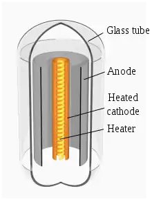 - Cathode: (electron emitter) has an electrically heated filament (which you can usually see glow red ) which spits out electrons that travel through the vacuum to the Anode (electron acceptor).