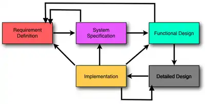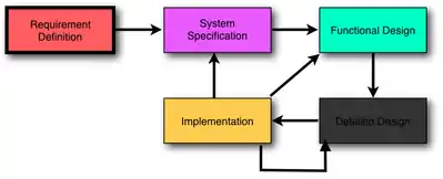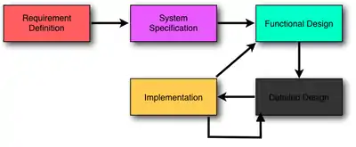 A typical project in this environment goes on the cycle shown in figure 1. Starting from the "requirement definition", which can be defined by the design team or deduced from a market research, the process undergoes a level of more and more details. It's convenient that issues are coming up in the "system specification", "functional design" or "detailed design" step by which the requirements need to be adjusted.