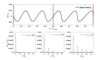 For this particular example the wave amplitude was set to achieve shock formation after five wavelengths. For generality all magnitudes of the solution are given in non-dimensional form. For the fluid, the parameter of nonlinearity was set to B/A = 5.0, which corresponds to fresh water at 20oC.[1] The upper portion of Figure 2 gives the spatial wave profile in which the wave steepening is readily apparent. In the lower three panels of Figure 2, the frequency spectrum of the velocity wave is shown as while passing through the regions indicated by red bands. The frequency spectrum plots were obtained using Discrete Fourier transform (DFT) of the calculated time domain signal at each indicated location.