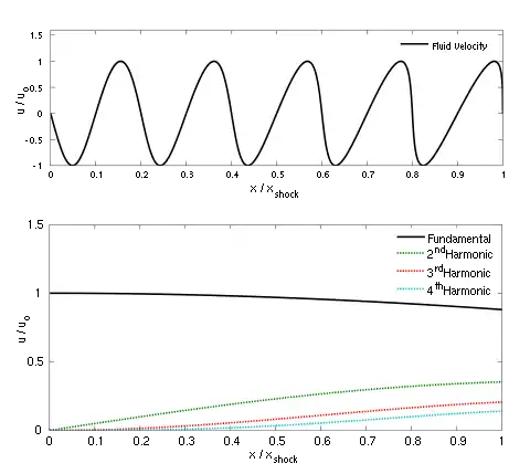 Where Jn is the Bessel function of the first kind. Historically, the subsequent work by Blackstock in 1966 [3] clarified the physical implications of this solution somewhat and also brought this solution to a wider audience in nonlinear acoustics. For additional details on this derivation refer to the texts by Pierce,[1] Elfno,[5] or Hamilton.[2] For completeness, Figure 3 plots the continuous harmonic profile as a function of normalized propagation distance. The wave conditions are the same as those used in calculations for Figure 2. In this particular example the shock formation occurs at five wavelengths; however, the plotted harmonic profile is general to any value of xshock.
