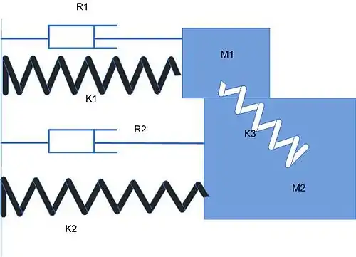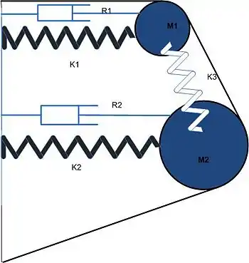 The motion of vocal fold can be described with two degrees of freedom. First rotation of mass M2 and displacement r. The equation of motion will be: