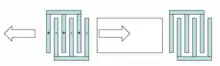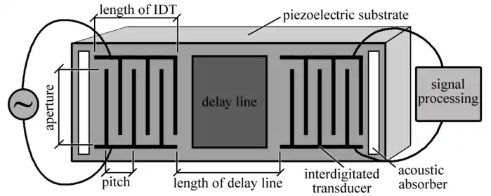 where is Rayleigh wave velocity determined by material properties and λ is the wavelength defined as the periodicity of the IDT. The figure below is SAW delay line configuration, which consists of two IDTs, one of them acting as the transmitter to generate acoustic waves, and the other as a receiver, the path between the IDTs is known as the delay-line. When an electric signal is applied on the interdigitated electrodes (IDT) with alternate polarity, as shown in Figure, an alternating regions of tensile and compressive strain between two fingers of the electrodes due to piezoelectric effect of material. A mechanical wave is generated at the surface. The mechanical wave propagates in both directions from the input IDT, only half of the energy of the mechanical wave propagates across the delay line in the direction of the output IDT. [4] The delay-line is sensing area, usually, the sensor material is deposited on the delay-line for chemical sensor to absorb the target analytics.