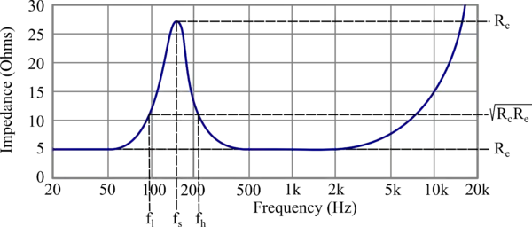 Once the impedance curve of the loudspeaker is measured, and can be directly identified by looking at the low frequency asymptote of the impedance value and the center frequency of the resonance peak. If the frequencies where are identified as and , Q factors can be calculated.