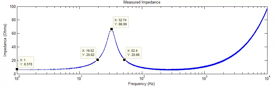 The low frequency asymptote is immediately identified as . The resonance is clear and centered at . The value of the impedance at this frequency is about . This yields , which occurs at and . With this information, we can compute some of the Thiele-Small parameters.