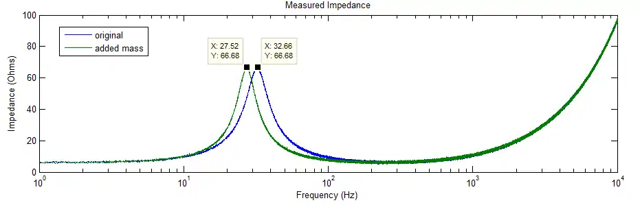 As a next step, a mass of is fixed to the loudspeaker diaphragm. This shifts the resonance frequency and yields a new impedance curve, as shown on figure 12.