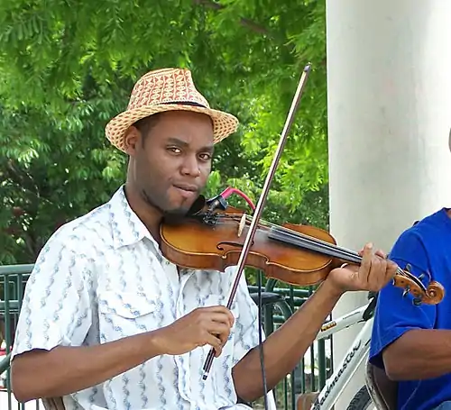 Anthropologist Dorice Tentchoff notes that Cajun enjoyment of pleasurable activities on Sunday is part of the stigmatization she associates with ethnic particularity in a homogenized US culture.[2] Known as "music of the veillée (evening with company)",[3]< old time Cajun fiddle music is a part of the American fiddle music canon with its own distinctive flair. Its derivation is the borderland of southwest Lousiana and southeast Texas.[4] It is one of the few extant North American folk music traditions rooted in French chanson [5] which also includes Quebec and Cape Breton traditions, with which Cajun repertoire shares repertoire.[6]