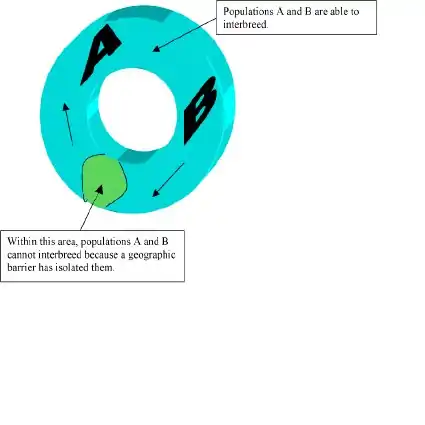 In this example, gene flow occurs throughout most of the circuit except for where the two populations overlap. The idea behind a ring species is that given enough distance and time, populations will diverge in their genetic makeup hindering their ability to interbreed.