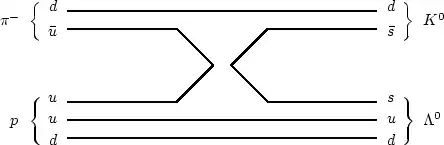 For example, the diagram given in Fig. 15.8, shows the quark rearrangement for the reaction (15.8). As you can see, when the pion collides with proton, its quark annihilates with the quark from the proton. At the same time, the pair is created from the vacuum. Then, the quark binds with the quark to form the strange meson , while the quark goes together with the pair as the strange baryon .