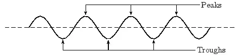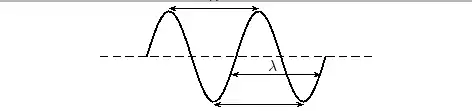 The amplitude is 2m. (Read above paragraph to know why). The distance from the peak to trough is 4m. Characteristics of Waves : WavelengthLook a little closer at the peaks and the troughs. The distance between two adjacent (next to each other) peaks is the same no matter which two adjacent peaks you choose. So there is a fixed distance between the peaks. Similarly, you'll notice that the distance between two adjacent troughs is the same no matter which two troughs you look at. But, more importantly, its is the same as the distance between the peaks. This distance which is a characteristic of the wave is called the wavelength. Waves have a characteristic wavelength. The symbol for the wavelength is the Greek letter lambda, .