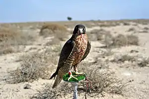 The Peregrine Falcon (Falco peregrinus), sometimes formerly known in North America as Duck Hawk, is a medium-sized falcon about the size of a large crow: 38-53 cm long. The English and scientific species names mean "wandering falcon", and refer to the fact that some populations are migratory. It has a wingspan of about 1 meter. Males weigh 570-710 grams; the noticeably larger females weigh 910-1190 grams.