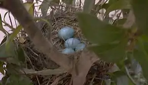 Their breeding habitat is semi-open areas with dense, low growth across most of North America. They are found in urban, suburban, and rural habitats. They build a bulky cup nest in a shrub or tree, close to the ground. Eggs are light blue in color, and clutch size ranges from 1-5, with 2-3 eggs most common. Both parents take turns feeding the young birds.
