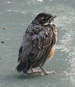 The American Robin has gray upperparts and head, and orange underparts, usually brighter in the male. Robins are frequently seen running across lawns, picking up earthworms by sight. In fact, the running and stopping behavior is a distinguishing characteristic. When stopping, they are believed to be listening for the movement of prey.