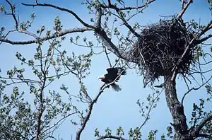 The osprey breeds by freshwater lakes, and sometimes on coastal brackish waters. The nest is a large heap of sticks built in trees, rocky outcrops, telephone poles or artificial platforms. In some regions with high Osprey densities, such as Chesapeake Bay, USA, most ospreys do not start breeding until they are five to seven years old, and there may be a shortage of suitable tall structures. If there are no nesting sites available, young ospreys may be forced to delay breeding. To ease this problem, posts may be erected to provide more sites suitable for nest building.