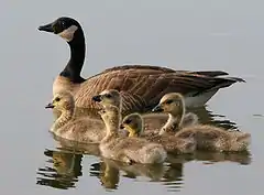 Adult geese are often seen leading their goslings in a line, usually with one parent at the front, and the other at the back of the "parade". While protecting their young, parents often violently chase away nearby creatures, from small blackbirds to other geese, to humans that approach, after warning them by giving off a hissing sound. The young do not leave their parents until after the spring migration, when they return to their birthplace.