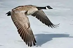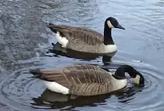 The black head and neck with white "chinstrap" distinguish this goose from all except the Barnacle Goose, but the latter has a black breast, and grey, rather than brownish, body plumage. There are seven subspecies of this bird, of varying sizes and plumage details, but all are recognizable as Canada Geese. Some are hard to distinguish from the Cackling Goose (Branta hutchinsii), with which the Canada Goose was long assumed to form one species; the name Lesser Canada Goose is, confusingly, often applied to B. hutchinsii.