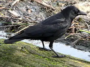 The American Crow is a distinctive bird with iridescent black feathers. Its legs, feet and bill are also black. Several regional forms are recognized and differ in bill proportion and overall size from each other across North America, generally being smallest in the southeast and the far west. Averaging 18 inches (46 cm) in length, it is smaller than the Common Raven. American Crows have a lifespan of 7 to 8 years. Captive birds are known to have lived up to 30 years.