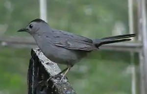 The catbird produces a variety of calls, including the familiar ones resembling a cat's meow, as well as an alarm call which resembles the quiet quacking of a male mallard.