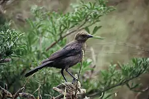 Breeding in open or semi-open country across most of North America, this bird is a brood parasite: it lays its eggs in the nests of other small perching birds, particularly those that build cup-like nests, such as the Yellow Warbler. The young cowbird is fed by the host parents at the expense of their own young.