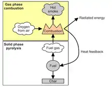 So solid phase pyrolysis refers to the generation of fuel vapor at a solid or liquid surface, while the visible flames are not due to combustion of the solid fuel itself, but rather of the gases released by its pyrolysis.