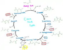 The citric acid cycle, also called the Krebs cycle, is the final stage of the oxidation of glucose. The carbon atoms enter the cycle as acetyl-CoA formed in the previous step (decarboxylation of pyruvate) and are oxidized in mitochondrial eight reactions to form various compounds such as CO2 and various hydrogens which are then captured by the NAD and FAD, produzind to three molecules of NADH and FADH2, and ATP release. These molecules formed during the Krebs cycle (NADH and FADH2) are acceptors H (receptors) intermediates of hydrogen which bind to protons (H +), released during the stages of metabolism of glucose, giving them for oxygen, which is acceptor (receiver) end of hydrogens.