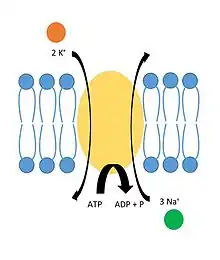 3 sodium ions are pumped out, while 2 potassium ions are pumped in