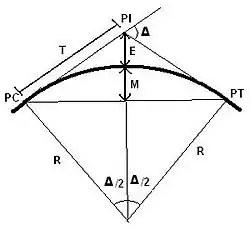 The distance between the PI and the vertex of the curve can be easily calculated by using the property of right triangles with and . Taking this distance and subtracting off the curve radius , the external distance , which is the smallest distance between the curve and PI, can be found.