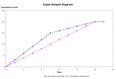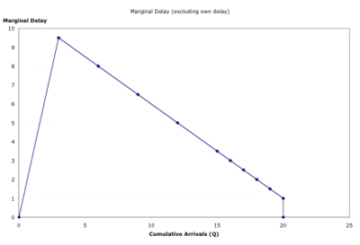 Second, travel time for a vehicle through a bottleneck depends on the number of vehicles that have come before, but not on the number of vehicles coming after. Similarly, the marginal delay that a vehicle imposes is only imposed on vehicles that come after. This implies that the first vehicle in the queue imposes the highest marginal delay, and the last vehicles in the queue have the lowest marginal delay. A marginal delay function that looks like figure on the right (bottom) is generated from the typical input-output diagram shown on the figure on the right (top). If marginal cost were equal to the marginal delay, then our pricing function would be unusual, and perhaps unstable. The instability might be tempered by making demand respond to price, rather than assuming it fixed (Rafferty and Levinson 2003), and by recognizing the stochastic nature of arrival and departure patterns, which would flatten the arrival curve to more closely resemble the departure curve, and thereby flatten the marginal delay curve.