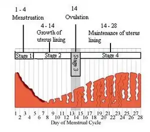 Stage 1. Days 1-4. Menstruation (bleeding) occurs. The lining of the uterus disintegrates and is shed. This is due to low levels of progesterone.