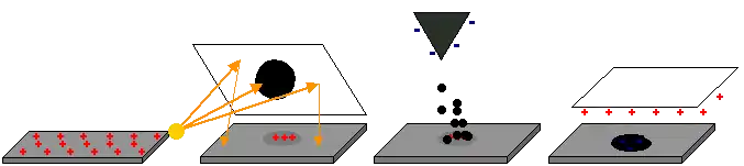 Paper is placed over the plate and a light shines onto the paper. Where the paper is white the light is reflected onto the plate. Where the paper is dark a shadow falls onto the plate. The light falling on the plate gives it just the extra energy needed to allow the charge to escape to earth. The plate becomes neutral where the paper is white but keeps its charge where the paper is black. The plate is now a copy of the paper with charges taking the place of ink. You could call this a template.