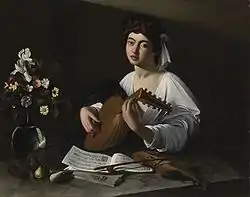 If you have a closer look at Caravaggio's painting, you will see several specular highlights: on the nose, on the hair, on the lips, on the lute, on the violin, on the bow, on the fruits, etc. The Phong reflection model includes a specular reflection term that can simulate such highlights on shiny surfaces; it even includes a parameter to specify a shininess of the material. The shininess specifies how small the highlights are: the shinier, the smaller the highlights.