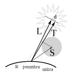 To this end, we consider a tangent in direction T to the sphere and passing through the surface point. Furthermore, this tangent is chosen to be in the plane spanned by L and S, i.e. parallel to the view plane of the figure to the left. The crucial observation is that the minimum distance of the center of the light source and this tangent line is directly related to the amount of shadowing of the surface point because it determines how large the area of the light source is that is visible from the surface point. More precisely spoken, we require a signed distance (positive if the tangent is on the same side of L as the sphere, negative otherwise) to determine whether the surface point is in the umbra (), in the penumbra (), or outside of the shadow ().
