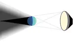While directional light sources and point light sources produce hard shadows, any area light source generates a soft shadow. This is also true for all real light sources, in particular the sun and any light bulb or lamp. From some points behind the shadow caster, no part of the light source is visible and the shadow is uniformly dark: this is the umbra. From other points, more or less of the light source is visible and the shadow is therefore less or more complete: this is the penumbra. Finally, there are points from where the whole area of the light source is visible: these points are outside of the shadow.