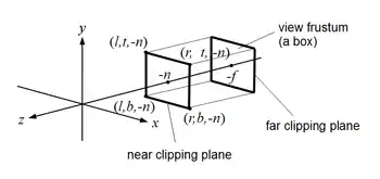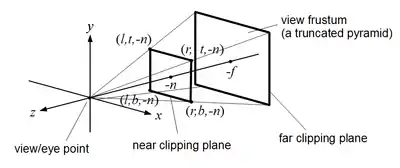 - coordinates (right), (left), (top), and (bottom) as illustrated in the corresponding figure. These coordinates determine the position of the front rectangle of the view frustum; thus, more view frustums (e.g. off-center) can be specified than with the aspect ratio and the field-of-view angle .