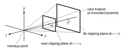 Together with the view point and the clipping planes, this centered rectangle defines the view frustum, i.e. the region of the 3D space that is visible for the specific projection transformation. All primitives and all parts of primitives that are outside of the view frustum are clipped away. The near and front clipping planes are necessary because depth values are stored with a finite precision; thus, it is not possible to cover an infinitely large view frustum.