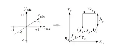 The projection transformation maps view coordinates to clip coordinates, which are then mapped to normalized device coordinates by the perspective division by the fourth component of the clip coordinates. In normalized device coordinates (ndc), the view volume is always a box centered around the origin with the coordinates inside the box between -1 and +1. This box is then mapped to screen coordinates (also called window coordinates) by the viewport transformation as illustrated in the corresponding figure. The parameters for this mapping are the coordinates and of the lower, left corner of the viewport (the rectangle of the screen that is rendered) and its width and height , as well as the depths and of the front and near clipping planes. (These depths are between 0 and 1). In OpenGL and OpenGL ES, these parameters are set with two functions: