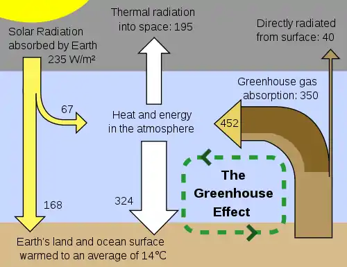 The greenhouse effect is the process by which radiation from a planet's atmosphere warms the planet's surface to a temperature above what it would be without this atmosphere. The intensity of the downward radiation – that is, the strength of the greenhouse effect – will depend on the atmosphere's temperature and on the amount of greenhouse gases that the atmosphere contains.