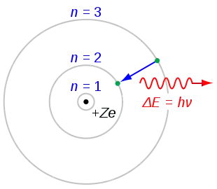 In this equation, is the energy of the photon which is equal to the difference in energy associated with the molecular transition between two quantum states, is the frequency of the corresponding electromagnetic wave, and h is Planck's constant. This relation, known as Planck's Law, is important because it links the concepts of thinking of radiation as both a particle and a wave. Figure 1. illustrates the concept of emission due to the electronic transition of electrons orbiting the nucleus of an atom. It should be noted that even though this picture shows electronic transitions for an atom, the same processes govern electronic transitions in molecules. Using Planck's Law, the total change of internal energy in a molecule can be described as: