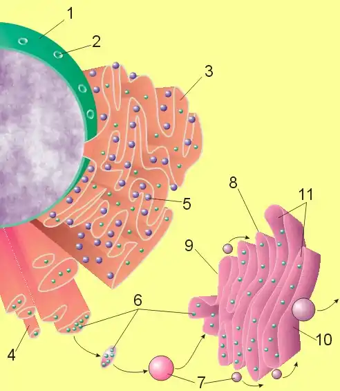 - RER: rough endoplasmic reticulum (site of protein synthesis) associated with ribosomes