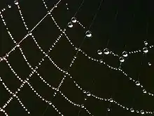 Water droplets adhere to a spiderweb. Their round shape is caused by cohesion.
