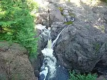 The Bad River begins its course over black lava where Copper Falls is located then continues onward until it links with Tyler’s Fork at Brownstone Falls. The Bad River flows from this point over red lava in which it has carved a deep gorge. It then cuts into the conglomerate rocks of Devil’s Gate until it makes its way through a thin strip of black shale. The river then encounters thick layers of shale and sandstone, after which it makes a 180 degree turn through red clays to cut back through the shale and sandstone.