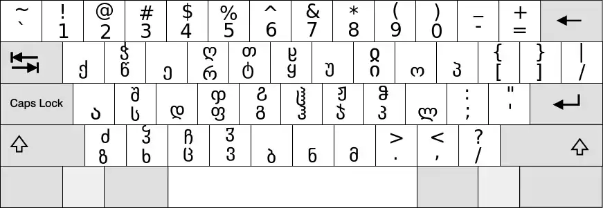 This is the Georgian QWERTY keyboard. Note that while Georgian has no capital letters, because Georgian has 33 letters and English has only 26, using the "shift" key is necessary to type Georgian.
