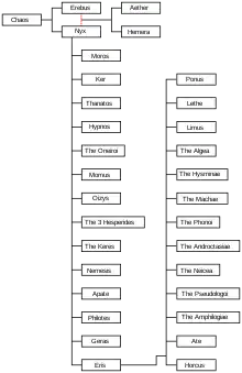 In the beginning, there was nothing but Chaos. Out of the chaos, Night and Erebus (The personification of Death and Shadow) materialized. They gave birth to Love, who in turn created Light and Day. Then came Gaea (earth), and Tartarus (the deepest pit in the world). Gaea first bore Uranus (heaven), and then she brought forth terrible creatures: The hundred-handers, who had a hundred hands and fifty heads, the Cyclopes, enormous creatures with only one eye, and the Titans. Uranus hated the Hundred-handers, and imprisoned all of them in Tartarus. Gaea didnt like this. She decided to have Cronus (one of the Titans) castrate his father with a jagged sickle. Cronus threw the severed members behind him and from the bloody drops earth conceived the Furies and Giants.