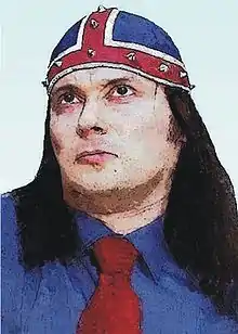 - Nýyrðaskáld: A nýyrðaskáld (neologist poet) is a native speaker of Icelandic, who differs from a ‘nýyrðasmíður’ (word-builder) in that ‘unlimited purism’ and ‘language protection’ are holy commitments. They wear a blue shirt, a red tie and a characteristic cap, patterned like a viking-helmet with the colors of the Icelandic flag. Both Icelandic flags are represented because a viking-helmet pattern on a cap always results into an inverted T-shape. The cap again symbolizes the protection of the language against foreign influence.